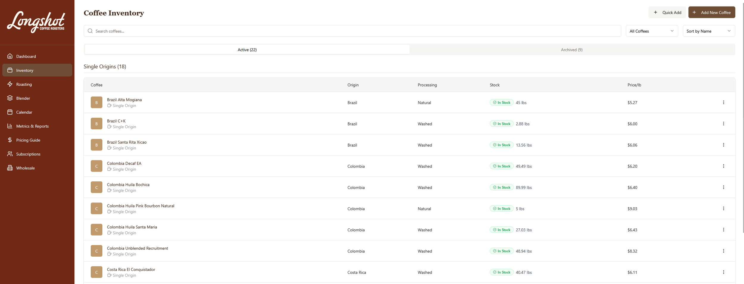 We started with inventory tracking. Inputting total weight, price per pound, price for shipping. Then we connected our roasting data to automatically subtract initial green coffee weight from the inventory in order to have accurate counts on hand.